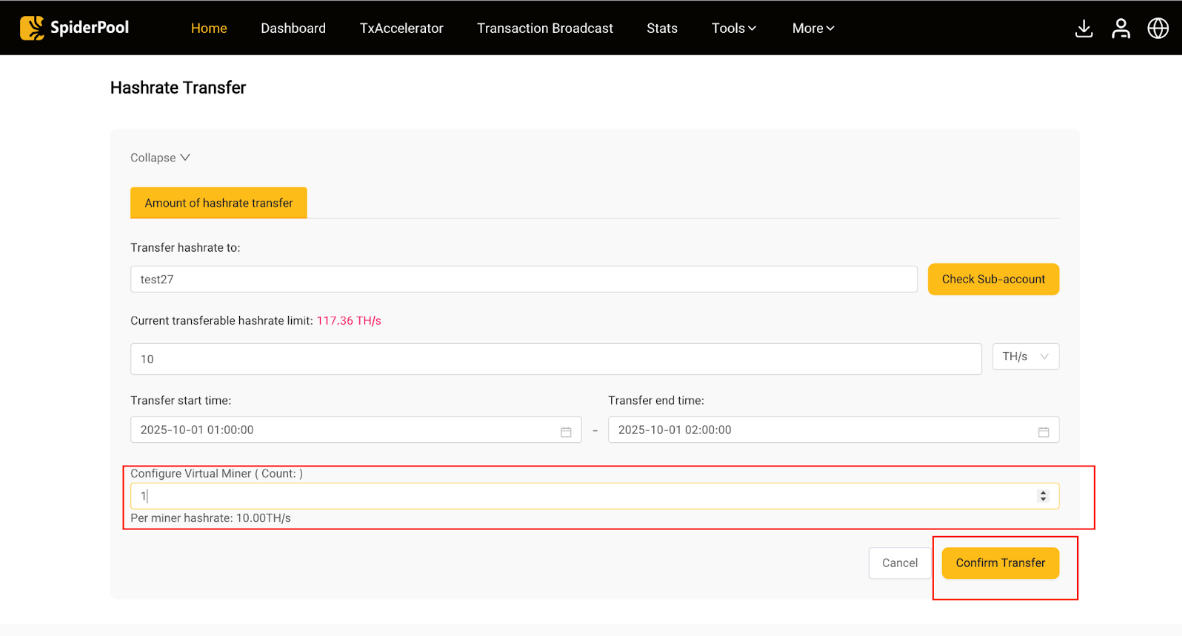 <mark style="color:red;">Important Notes:</mark>\ <mark style="color:red;">1）The transfer target is limited to sub-accounts under the same account.</mark>\ <mark style="color:red;">2）The minimum transferable hashrate is 10 TH/s.</mark>\ <mark style="color:red;">3) The start time must be selected at a future hour.</mark>\ <mark style="color:red;">4）Sub-accounts that have already accepted transferred hashrate cannot transfer it again.</mark>\ <mark style="color:red;">5）Sub-accounts that have already transferred hashrate cannot accept transfers from other sub-accounts.</mark>